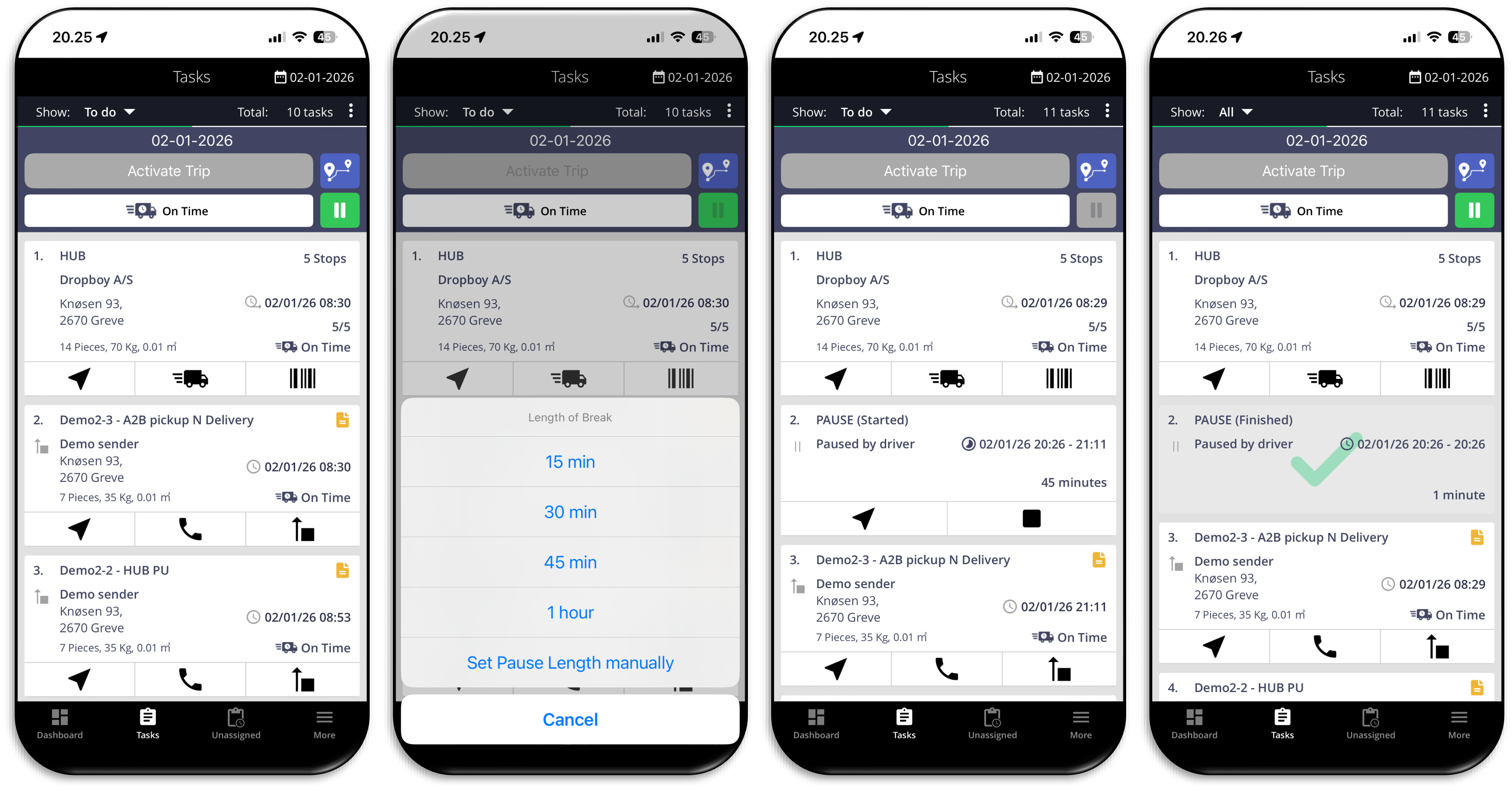 - The break starts immediately at the driver’s current location and appears in the task list.